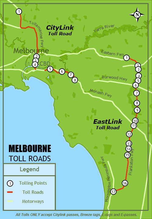 The toll roads in Victoria can be found in and around the capital city of Melbourne. Citylink is one of the city's major travelling routes and has several tolling and entrance points.