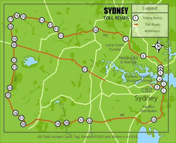 The toll points in New South Wales can be found in Sydney along the M2, M5, M7, Lane Cove Tunnel, Military Road E-Ramps, the Eastern Distributor, the Cross City Tunnel and the Sydney Harbour Bridge and Tunnel.